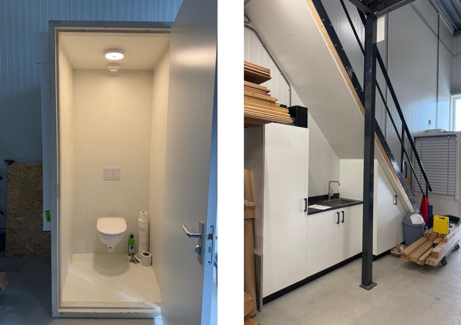 Bedrijfsruimte met toiletruimte, groepenkast, keuken en entresolvloer.