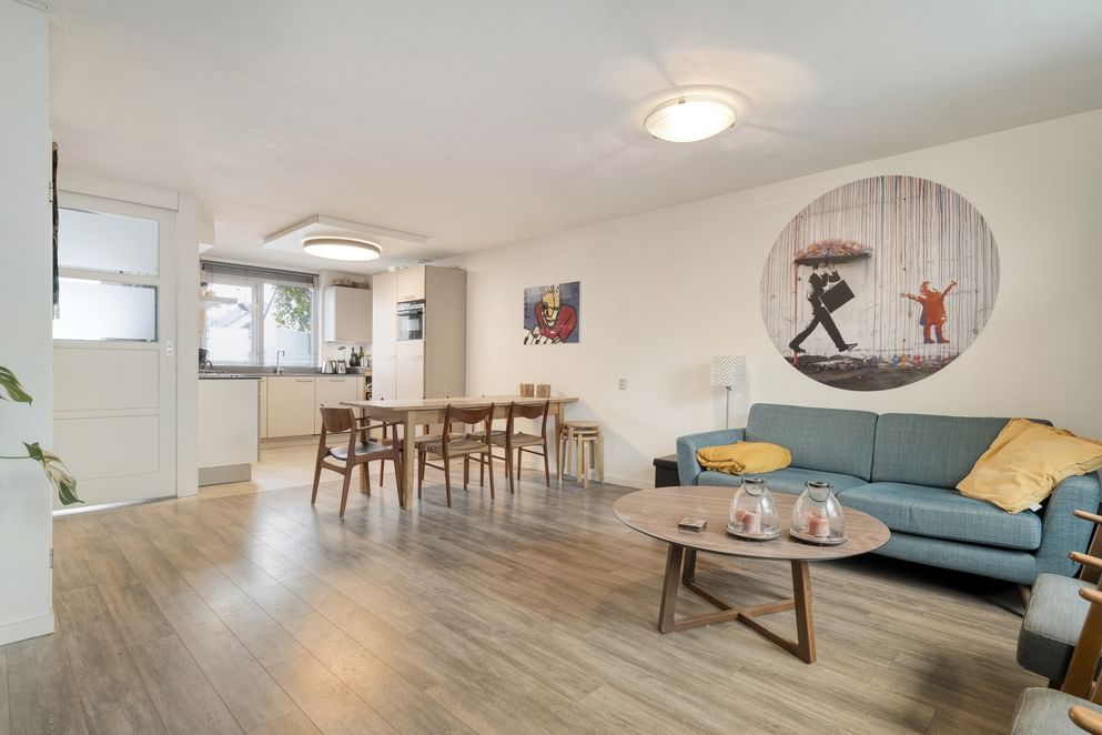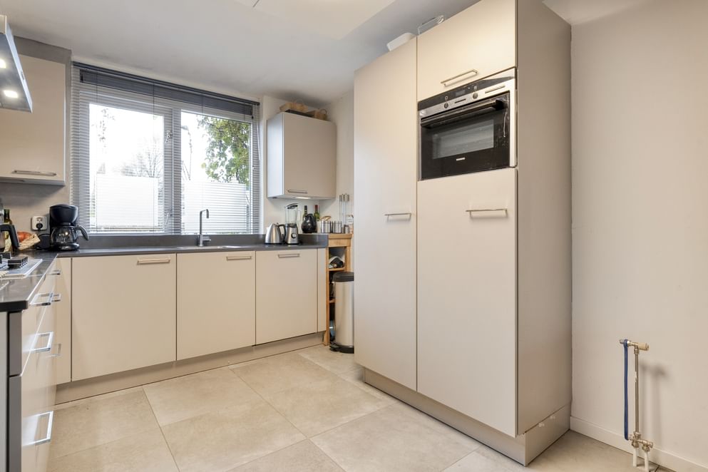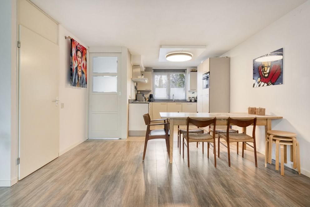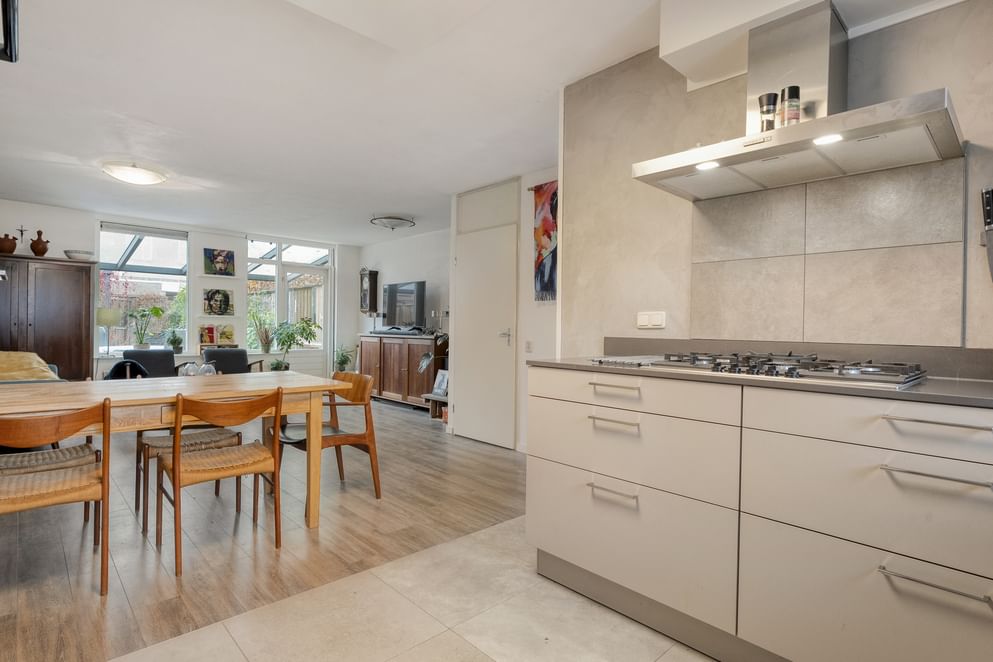 Je komt binnen in de hal, waar zich het toilet en de trapopgang naar boven bevinden. Vanuit hier loop je door naar de ruime woonkamer, die dankzij de prettige indeling genoeg plek biedt voor zowel een zit- als eetgedeelte. De woonkamer staat in fijne verbinding met de keuken, die in 2019 is geplaatst en is uitgerust met een koelkast, vaatwasser en 5-pits gasfornuis. Een functionele en complete keuken waar je prettig kunt koken.