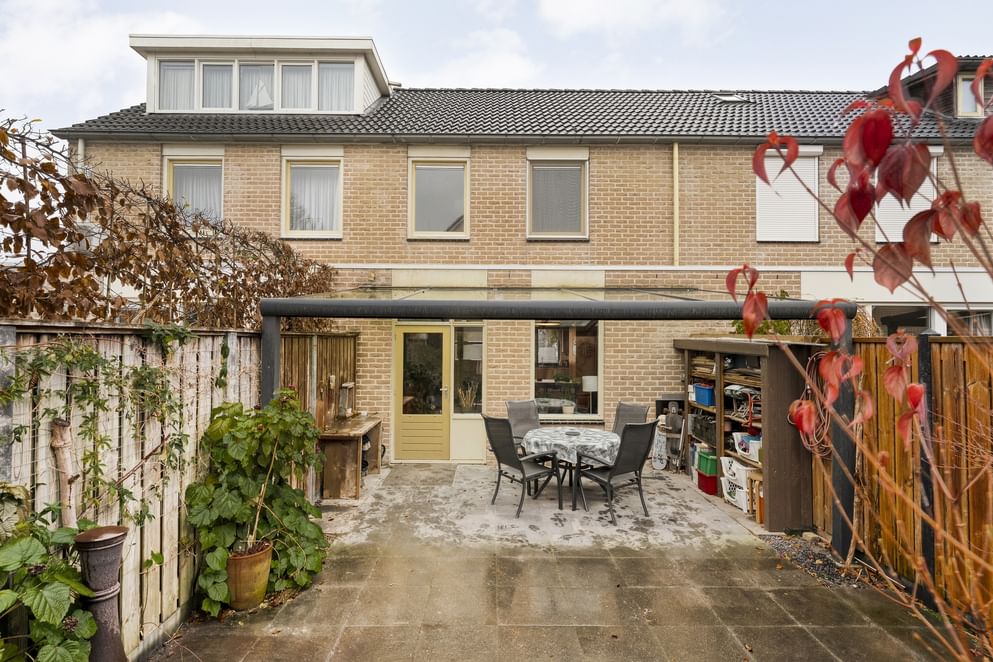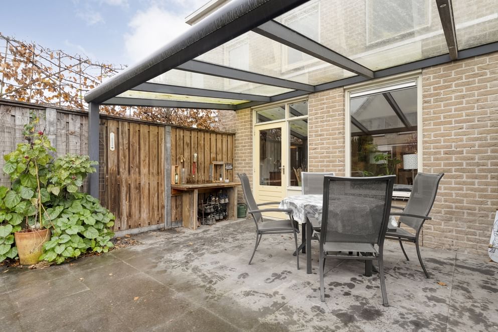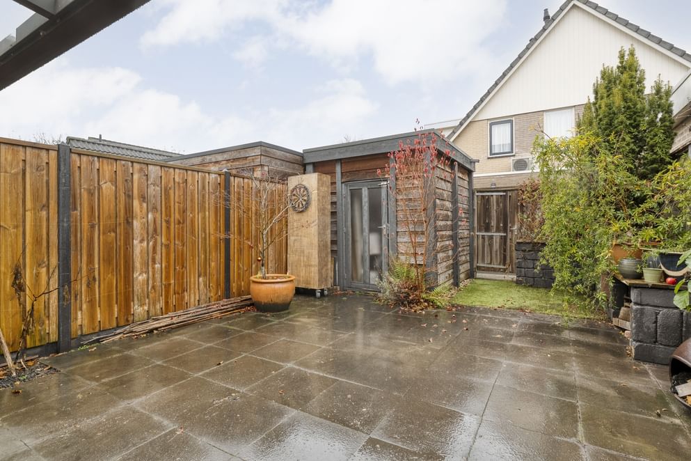 De tuin is onderhoudsvriendelijk aangelegd en beschikt over een mooie overkapping, waardoor je hier vrijwel het hele jaar door kunt genieten van een fijne zitplek. Daarnaast zijn er een berging en een achterom, wat de tuin extra praktisch maakt.