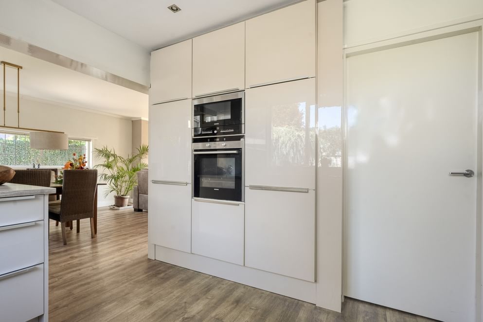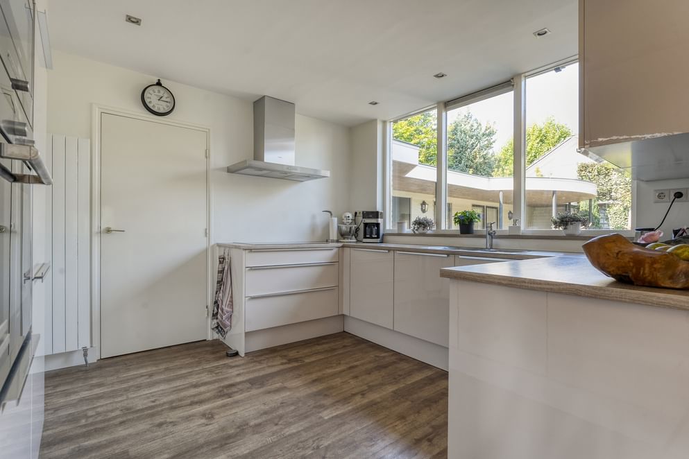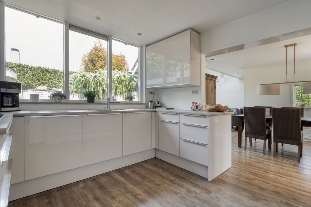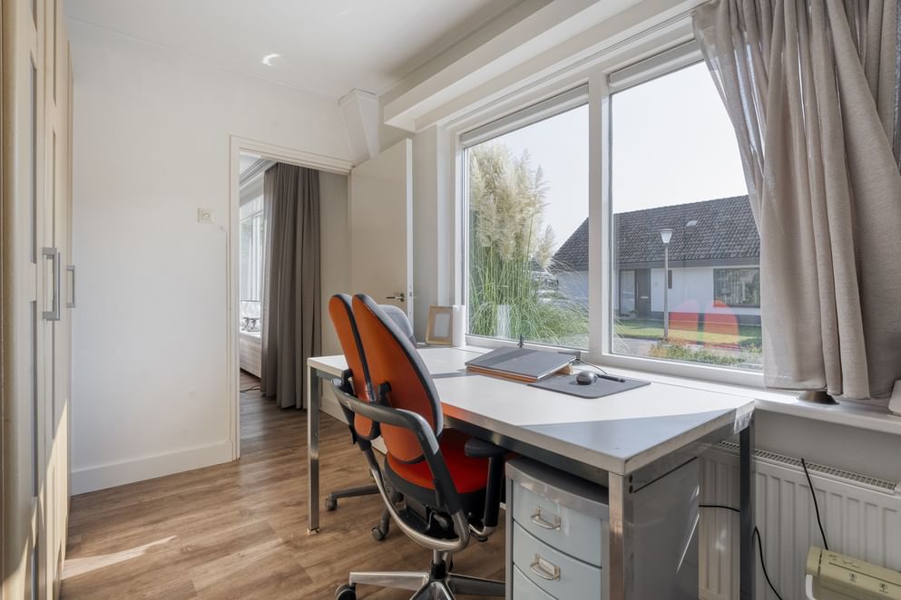 Je betreedt de woning via de entree met de meterkast, het toilet en de trapopgang naar de eerste verdieping. Vanuit de hal kom je in de keuken, de woonkamer en het kantoor. De woonkamer is ruim opgezet en beschikt over een sfeervolle gashaard. Er is voldoende plek voor een apart eetgedeelte en de ruimte loopt door in een lichte tuinkamer met dubbele openslaande deuren naar de achtertuin. Ook vanuit het eetgedeelte is de tuin direct bereikbaar. Het kantoor is zowel vanuit de hal als vanuit de woonkamer toegankelijk. De keuken is uitgerust met diverse inbouwapparatuur, waaronder een 5-zone inductiekookplaat, oven, magnetron, koelkast en afzuigkap. Aansluitend bevindt zich de bijkeuken met witgoedaansluitingen en ruimte voor een vaatwasser en extra koelkast. Ook vanuit de bijkeuken heb je toegang tot de achtertuin.