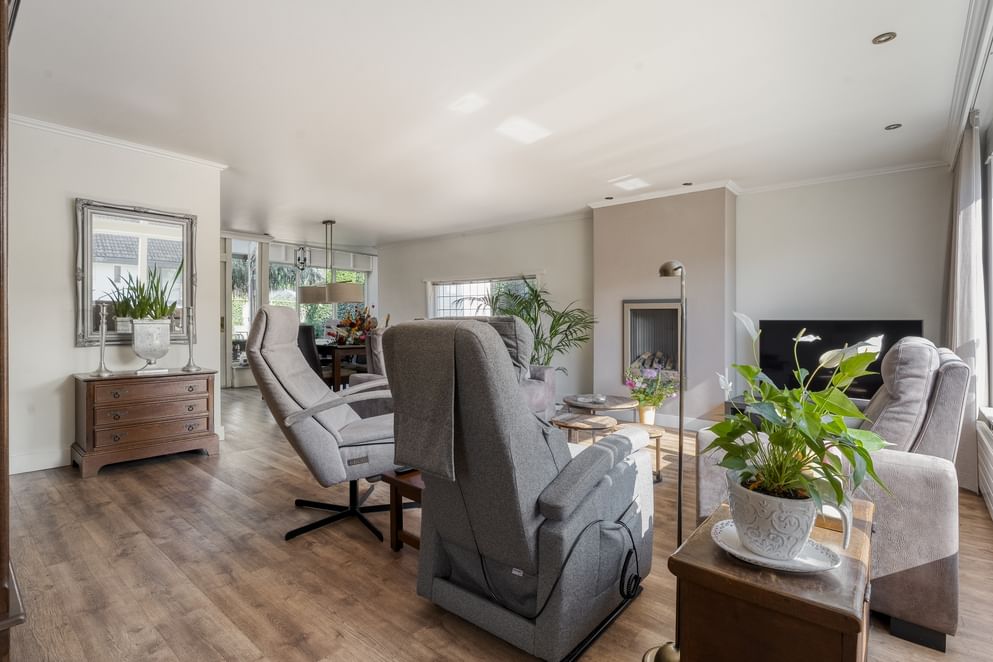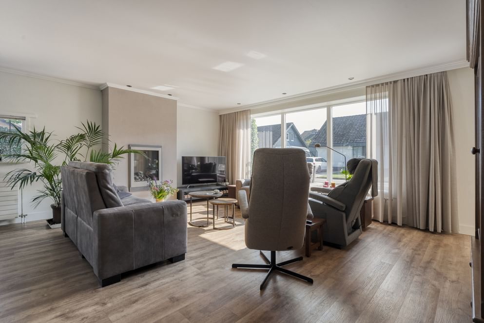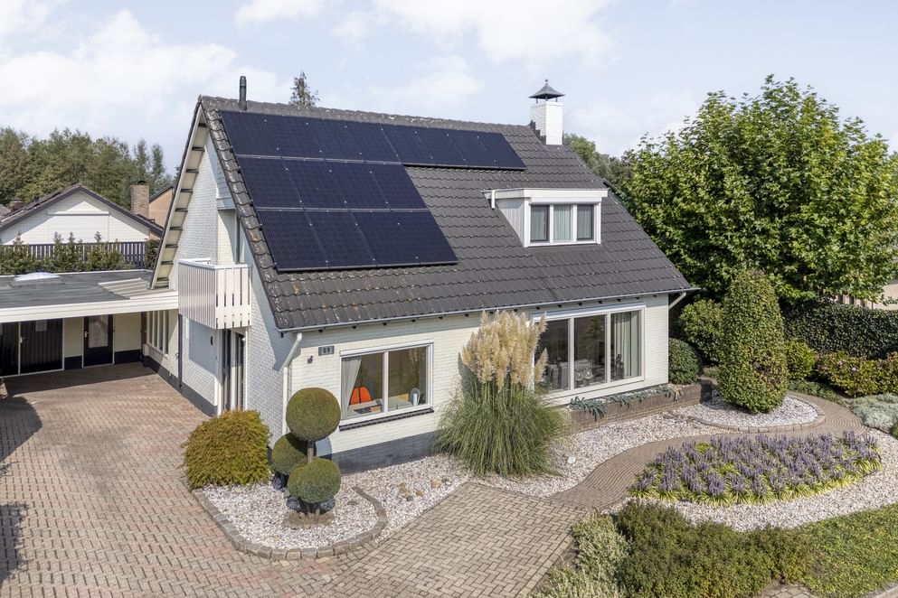 De woning is voorzien van energielabel A+, 16 zonnepanelen, hybride warmtepomp en vloerverwarming op een groot deel van de begane grond én in de badkamer, wat zorgt voor comfort en lage energielasten. De woonkamer is sfeervol ingericht met een gashaard en grenst aan de sfeervolle tuinkamer met openslaande deuren naar de achtertuin. Op de begane grond is daarnaast een multifunctionele kamer aanwezig, ideaal als kantoor of speelruimte. Boven is ruimte voor maar liefst vier slaapkamers, en de zolder biedt extra bergruimte. Aan de buitenzijde op een ruim perceel van 550 m² vind je een ruime oprit met carport, een vrijstaande garage en een overkapping in de achtertuin – een fijne plek om in alle rust en privacy buiten te genieten. Een ideale gezinswoning die energiezuinig wonen combineert met comfort, ruimte en veel mogelijkheden.
