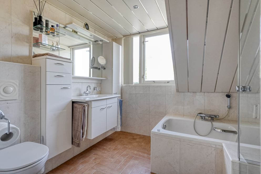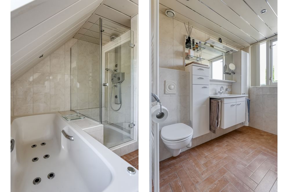 Vanaf de overloop zijn vier slaapkamers en de badkamer bereikbaar. Ook vindt je op de overloop een loopdeur naar het balkon. De badkamer beschikt over een whirlpool, toilet, wastafel en vloerverwarming.