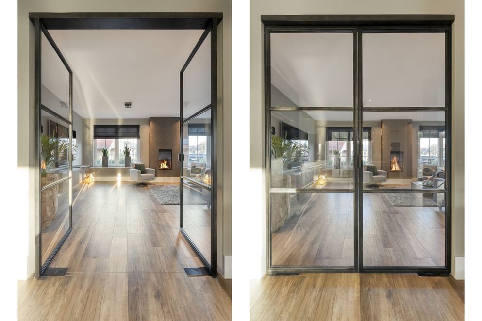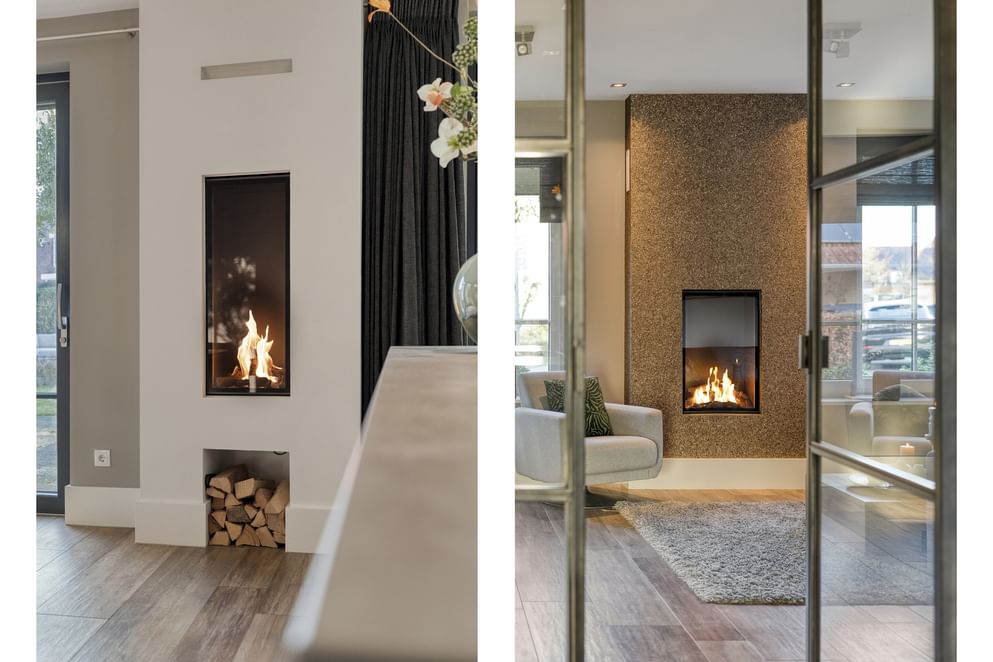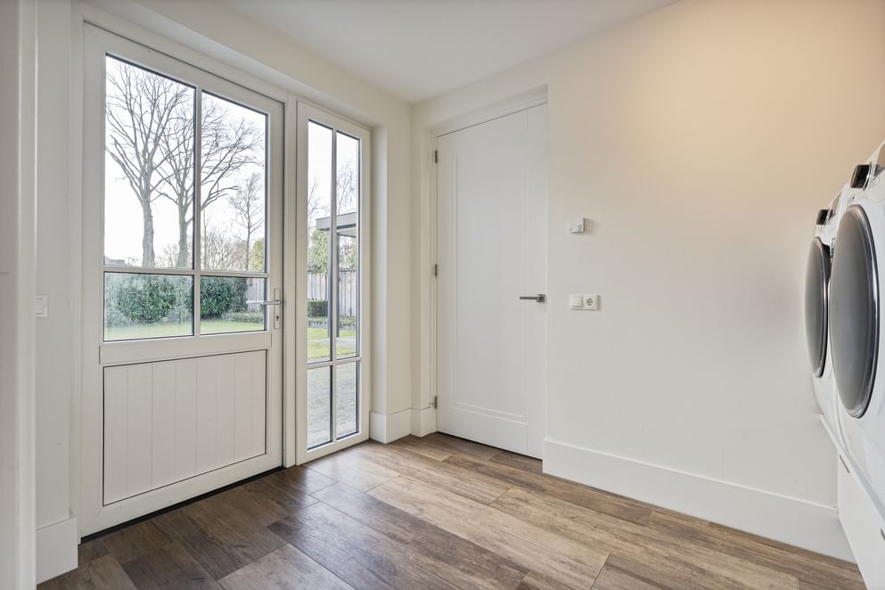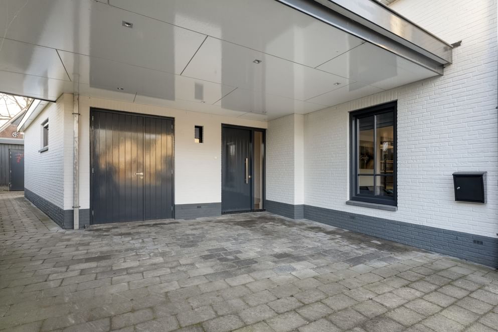 Via de ruime oprit met ruime carport, kom je binnen via de overdekte entree in de royale hal. Deze is voorzien van een garderobe, meterkast, modern toilet en een fraaie eikenhouten trap naar boven. Vanuit de hal loop je direct door naar de grote woonkeuken. De keuken is modern uitgevoerd en heeft een sfeervolle gashaard, welke zorgt voor gezelligheid en warmte tijdens het diner, of wanneer je zomaar met vrienden aan tafel zit. Verder is de keuken voorzien van een kookeiland, veel bergruimte, hoogwaardige inbouwapparatuur en een schuifpui naar het overdekte terras. Via de indrukwekkende stalen taatsdeuren kom je in de sfeervol ingerichte woonkamer met hierin een tweede gashaard. Vanuit de keuken, kom je ook in de bijkeuken met verhoogde opstelling voor wasmachine en droger, een extra uitstortgootsteen en vaste kastruimte. Vanuit de bijkeuken heb je toegang tot het royale en fraai afgewerkte kantoor aan de achterzijde van de woning. Dit is een rustige, lichte ruimte. Ideaal voor thuiswerken of een praktijk aan huis. De berging aan de voorzijde is zowel via de bijkeuken als via de carport bereikbaar.