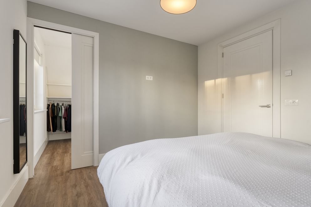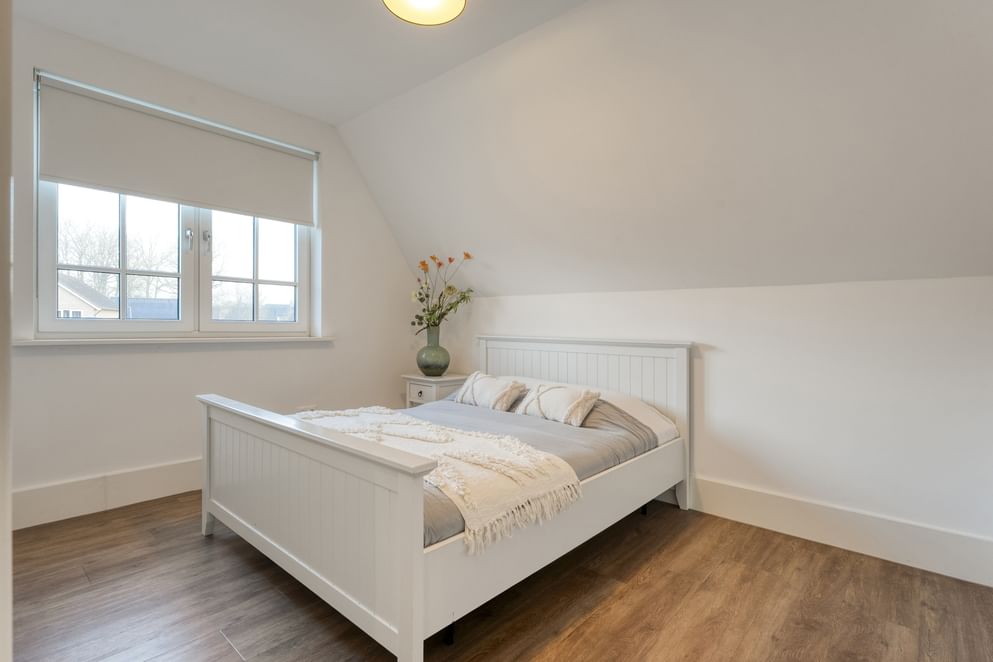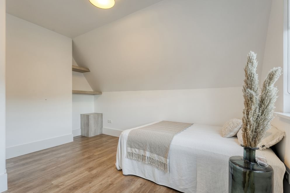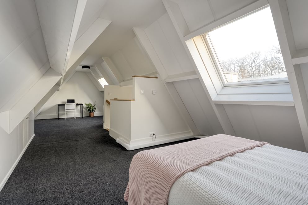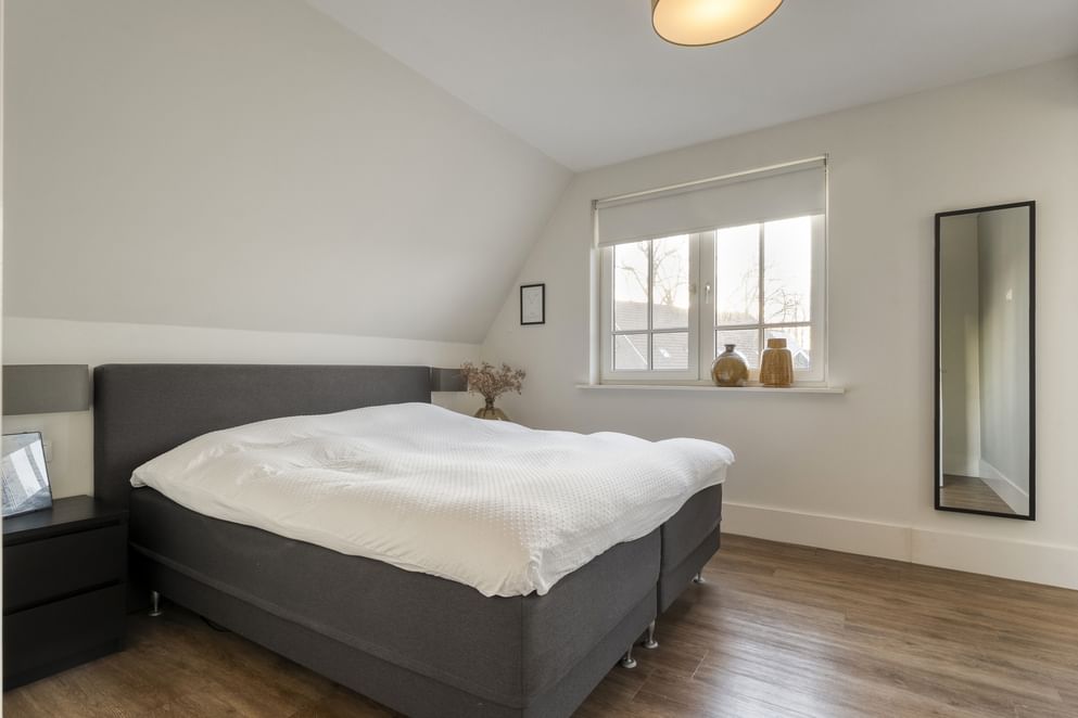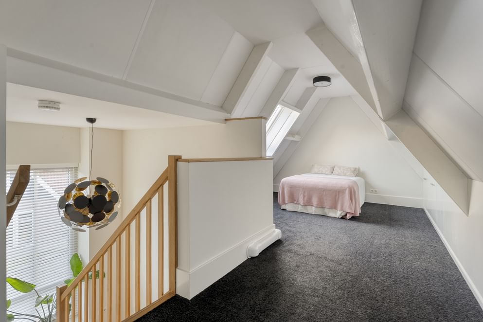 Een vaste trap leidt naar een ruime zolderverdieping. Dankzij meerdere dakramen en de risaliet is het hier heerlijk licht. De ruimte is keurig afgewerkt en voorzien van bergruimte achter de knieschotten, waardoor het geheel ook praktisch is ingericht. Deze verdieping is zeer geschikt om te slapen, maar ook om als hobbyruimte of thuiswerkplek te gebruiken.